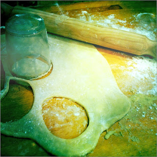 Using a rolling pin, roll the dough out to about 3 mm thick making sure that the surface is heavily floured so it does not stick. Round the dough using a glass and add 1 teaspoon of the mincemeat, and fold into half moons.